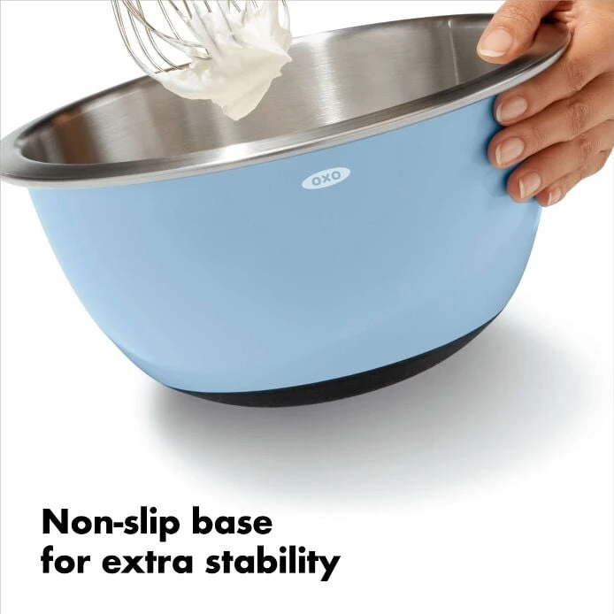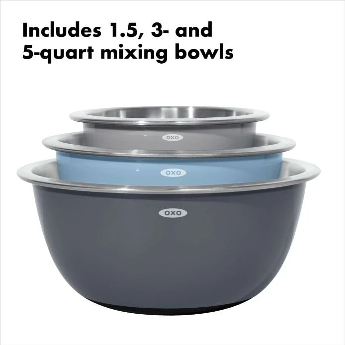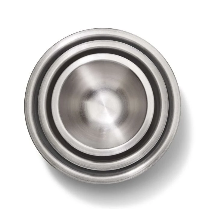 Our Stainless Steel Mixing Bowls feature brushed stainless steel interiors that take on the temperature of ingredients, plus white plastic exteriors that keep your hands at room temperature. The non-slip bases won’t slide while mixing and the dishwasher-safe bowls nest for simple storage. Set includes 1.5-quart, 3-quart and 5-quart Mixing Bowls.