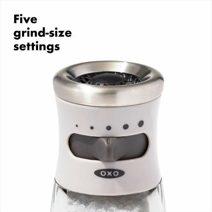 The OXO Good Grips Contoured Mess-Free Salt Grinder dispenses from the top, for less mess on your counters. Slide the tab to choose from five grind-size options. Made from non-corrosive ceramic, the durable grinder mechanism won’t absorb flavors or odors, so it works for all types of peppercorns, salts, and whole spices like cumin, coriander and cloves. An airtight lid keeps spices fresh and dry while the non-slip grip on the base allows for easy, comfortable use. Our manual Grinder has stainless steel accents and a clear acrylic body, so you’ll know when it’s time to refill. Comes pre-filled with coarse salt. Hand wash only.