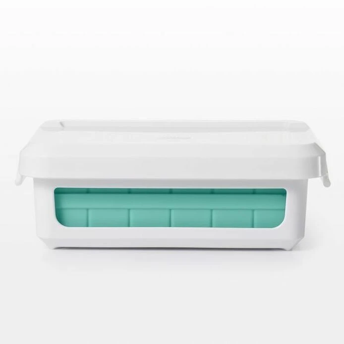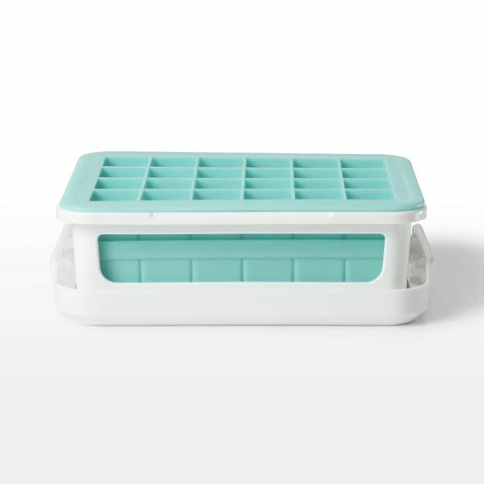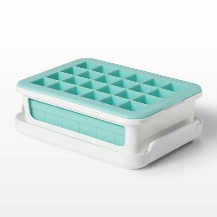 With two separate trays, this Covered Silicone Ice Cube Tray makes 48 small (7/8″ square) cubes in total. Flexible silicone allows for easy removal, while the frame provides support during filling, moving and storage. Cover keeps out odors and allows for stacking multiple trays.