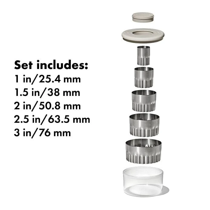 Whether you’re baking cookies, biscuits or scones, the OXO Good Grips Double-Sided Cookie & Biscuit Cutter Set has got the size you need for a uniform batch. Plus they’re reversible—one side is flat and the other is scalloped to give those biscuits, scones or tarts the delicate, fluted edge they deserve. The set of five stainless steel cutters come in 1 in/25.4 mm; 1.5 in/38 mm; 2 in/50.8 mm; 2.5 in/63.5 mm; and 3 in/76 mm sizes. With so many sizes, the possibilities are endless—use them to cook an egg, core an apple or make dumplings. Plus, the set features a soft, non-slip silicone hand guard that’s comfortable and helps prevent hand fatigue while cutting dough. We’ve also included a storage case with lid that makes it simple to store the cutters when not in use. Dishwasher safe.