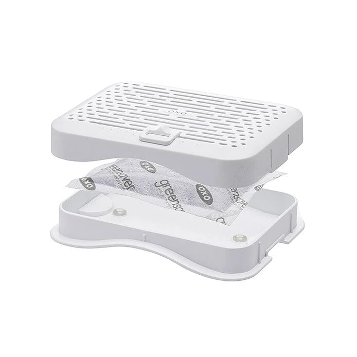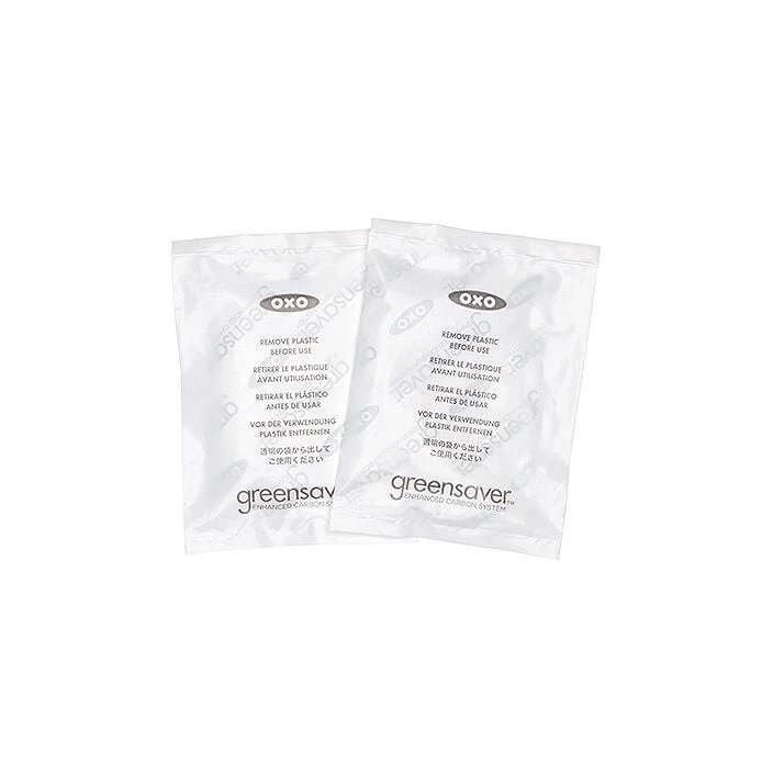 Fruits and vegetables naturally emit ethylene gas, which causes premature spoilage. GreenSaver Crisper Inserts mount with suction cups on crisper walls above produce to absorb ethylene with non-toxic enhanced carbon filters. Filters last 90 days. Pack includes 2 Crisper Inserts and 2 filters.