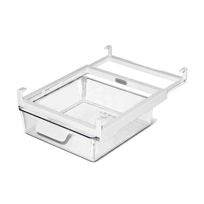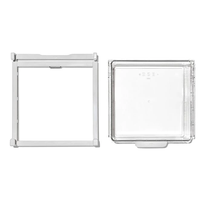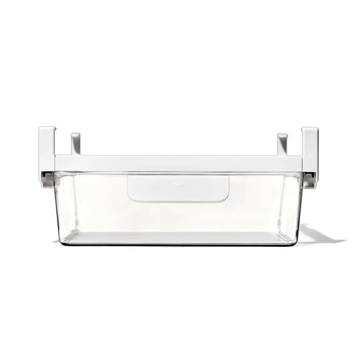 Organize the contents of your fridge to cut down on clutter and prevent food waster. The OXO Good Grips Fridge-Focused Organization System features a combination of bins, drawers, shelves, and risers, to help streamline your refrigerator. The clear, space-saving Undershelf Drawer provides a visually pleasing way to keep food from getting lost and helps prevent food waste. The adjustable frame securely attaches to fridge shelves, without the need for tools. The generously sized drawer fits deli meat, cheese and produce and ensures freshness. Also available in 14 in.