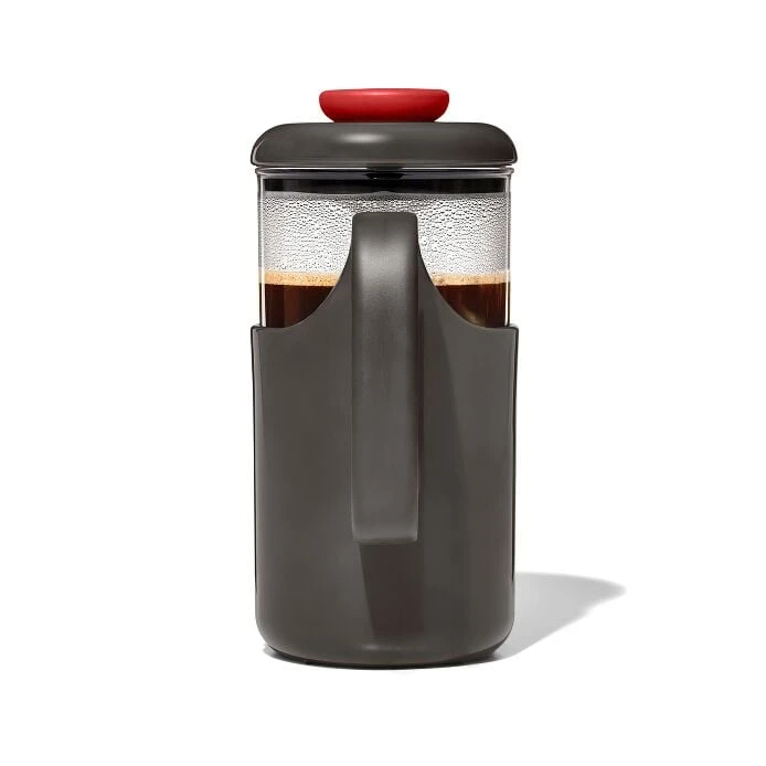 Features 8-cup capacity French press is ideal for brewing smooth, rich coffee anytime, anywhere Shatter-resistant carafe is made from BPA-free, food-safe Tritan™ Renew Durable, protective case with easy-view windows show when it’s time brew a new batch Stainless steel filter with silicone edge filters out coffee grounds and disassembles for easy cleaning Slotted spout provides extra filtration for smooth, grit-free sipping Soft, non-slip handle and knob makes for comfortable pressing and pouring