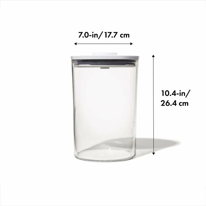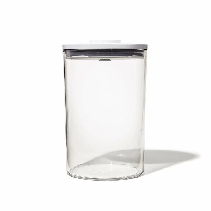 Keep dry foods and ingredients fresh and close at hand with the OXO Good Grips 5.2 Qt/4.9 L POP Round Container. The Container has a push-button lid that creates an airtight seal—and doubles as a handle for easy, one-handed opening. POP Round Containers are perfectly calibrated to store common household staples like cereal, flour, sugar, pasta, rice, coffee, nuts, snacks and more. They nest with lids on for convenient storage. POP Containers aren’t just for kitchens: Use them any place you want more organization. For best results, always use the button to open and close. Do not carry POP Containers by the lid. BPA free. Dishwasher safe.