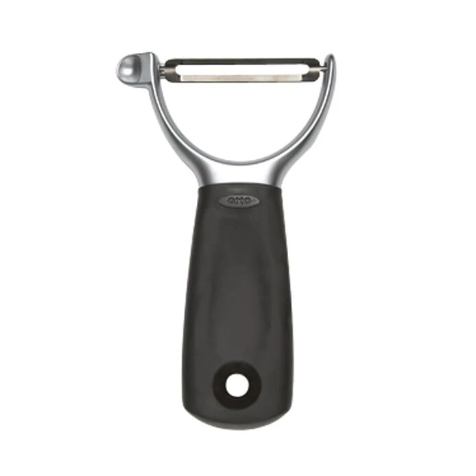 The Pro Y Peeler is constructed of sturdy die-cast zinc and features a precision-ground, extra-hardened stainless steel blade for durability and efficiency. Also includes an eyer for removing blemishes.